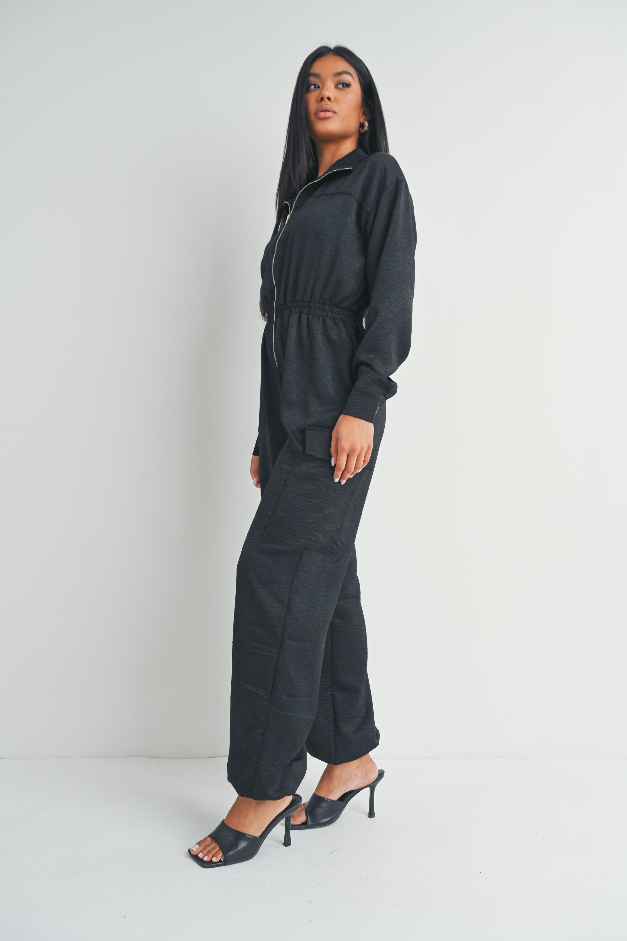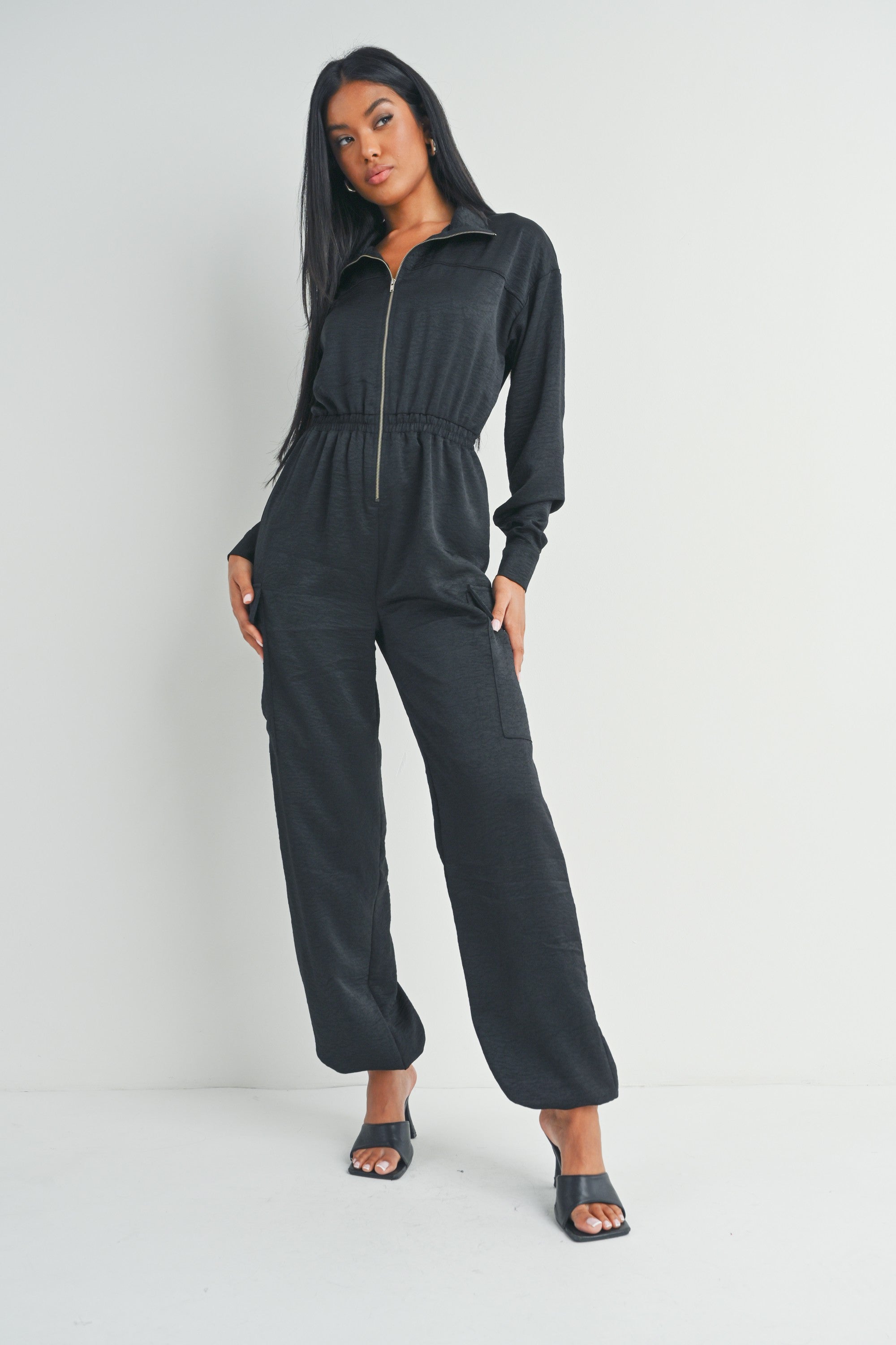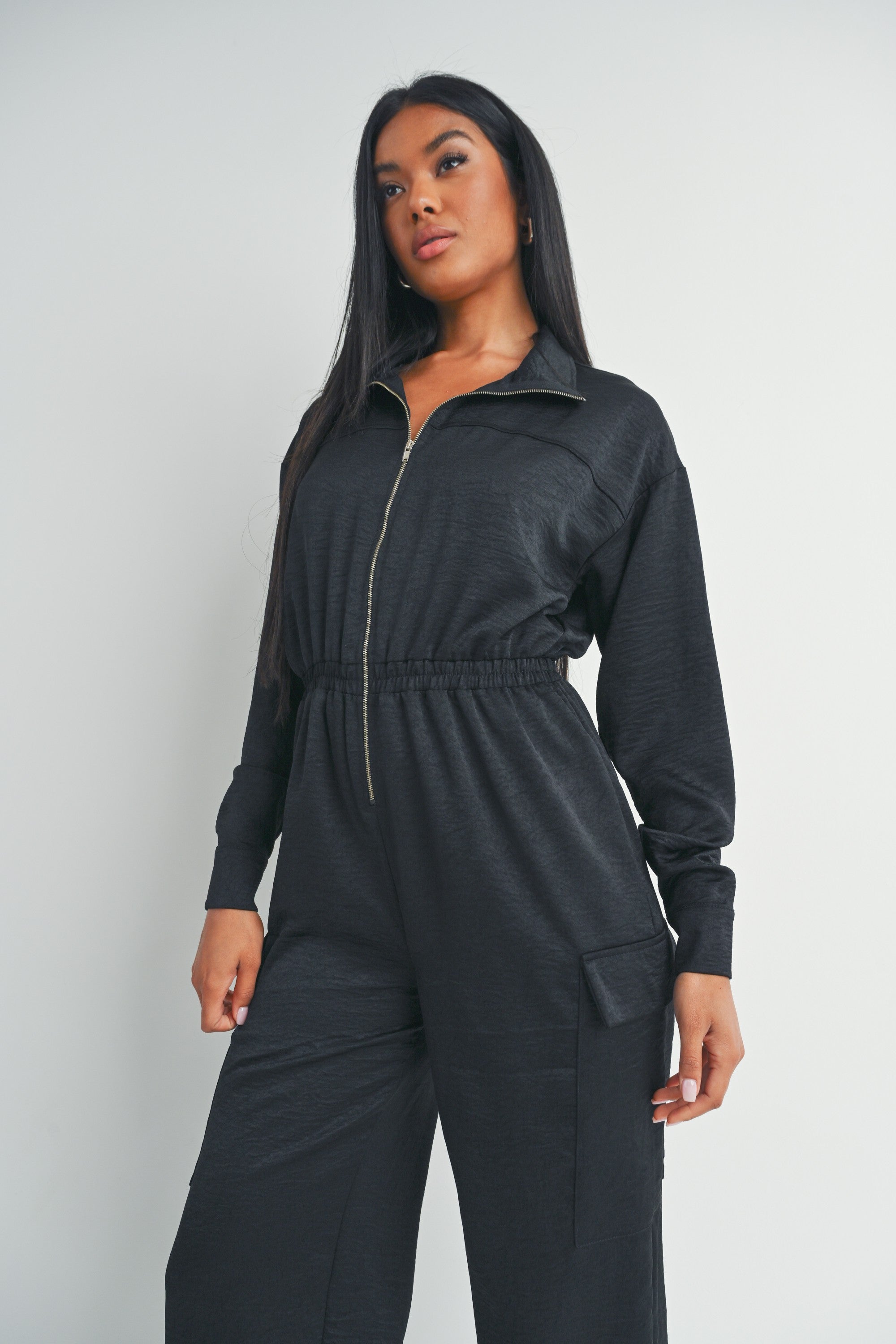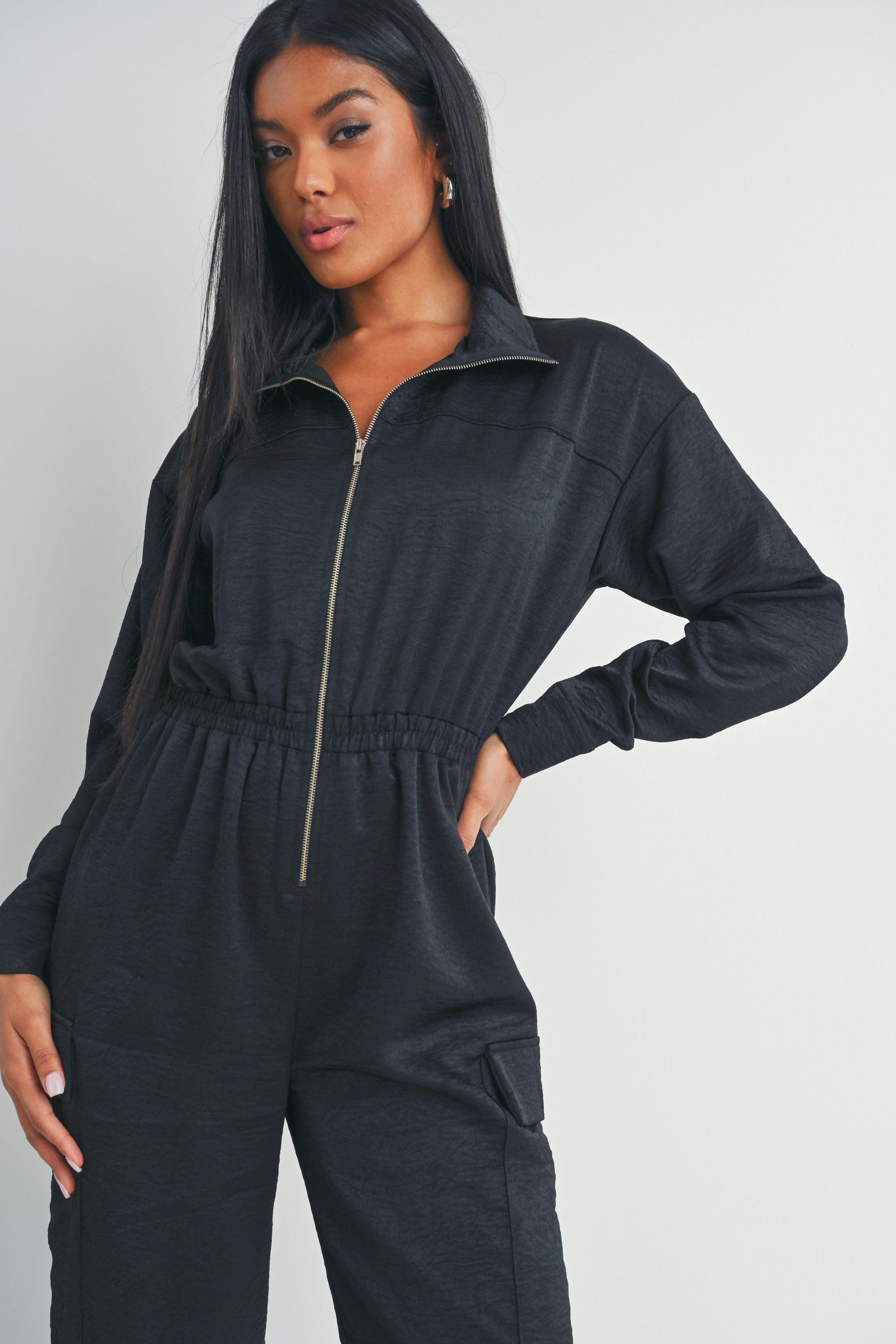 This black long-sleeved zip-up jumpsuit features a collared neckline, utility pockets, and a cinched waist for a flattering fit.