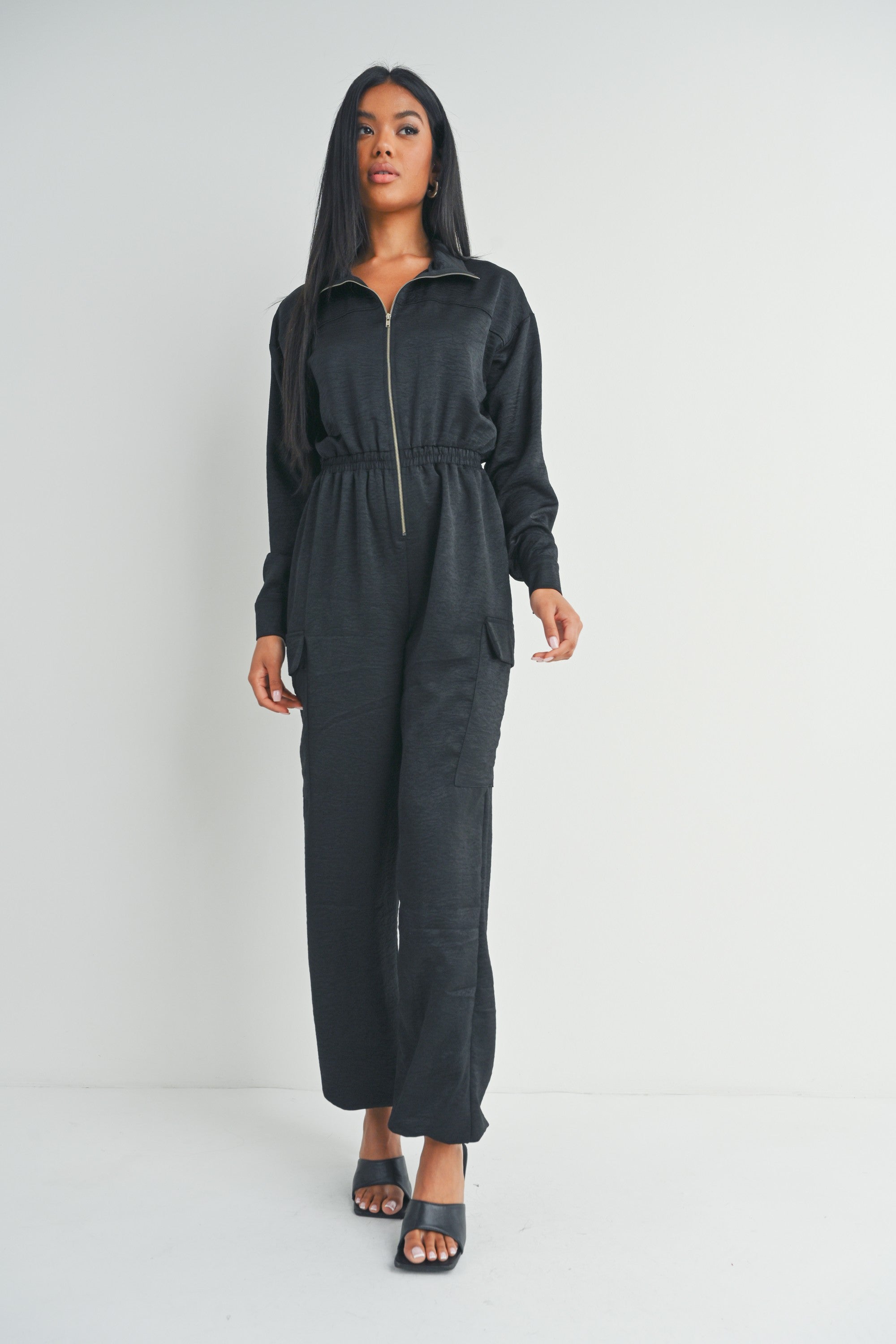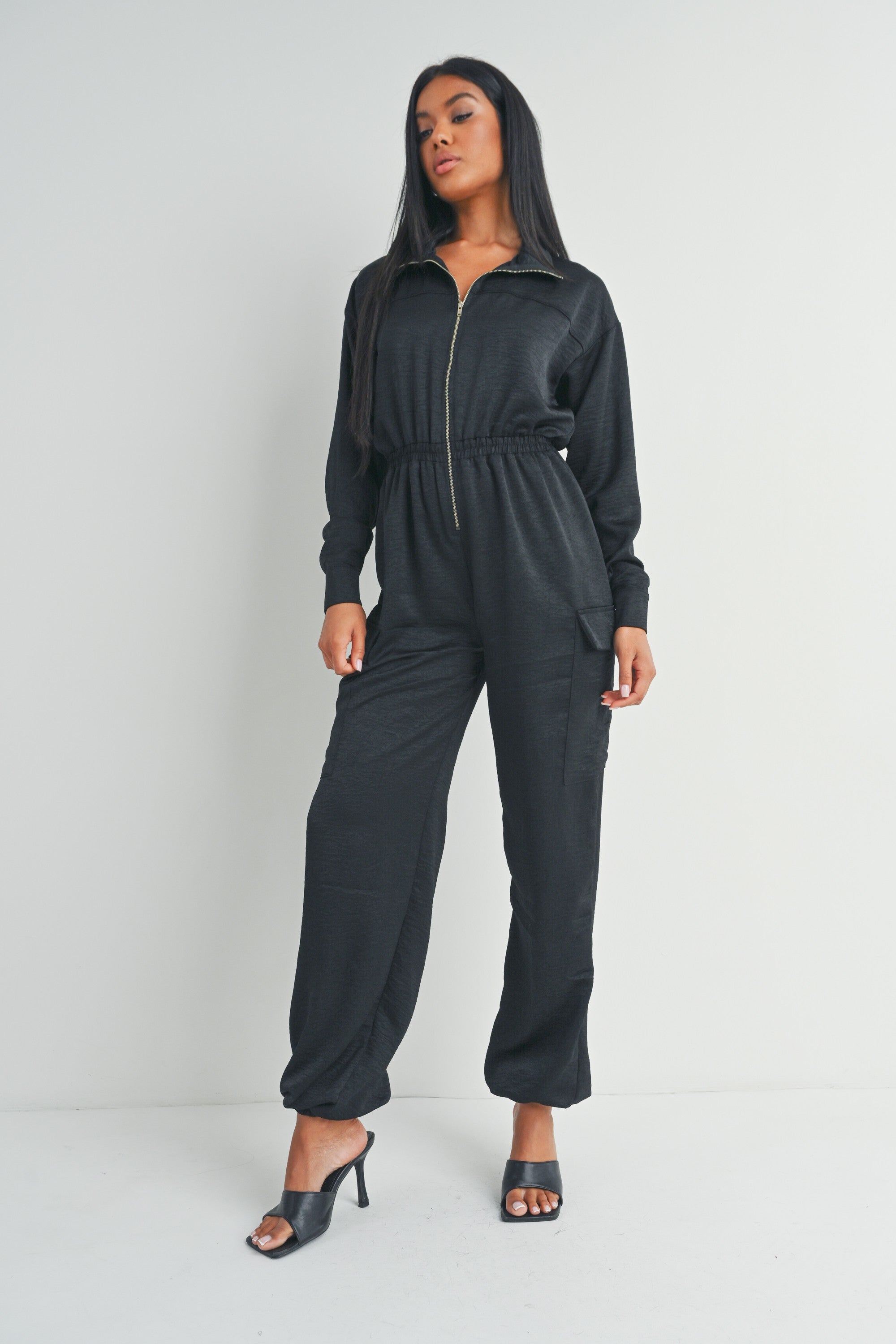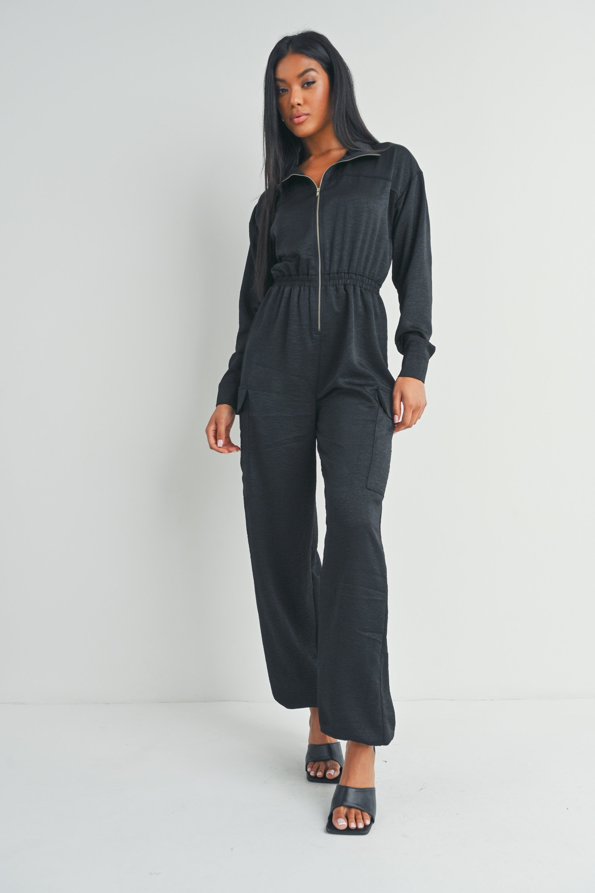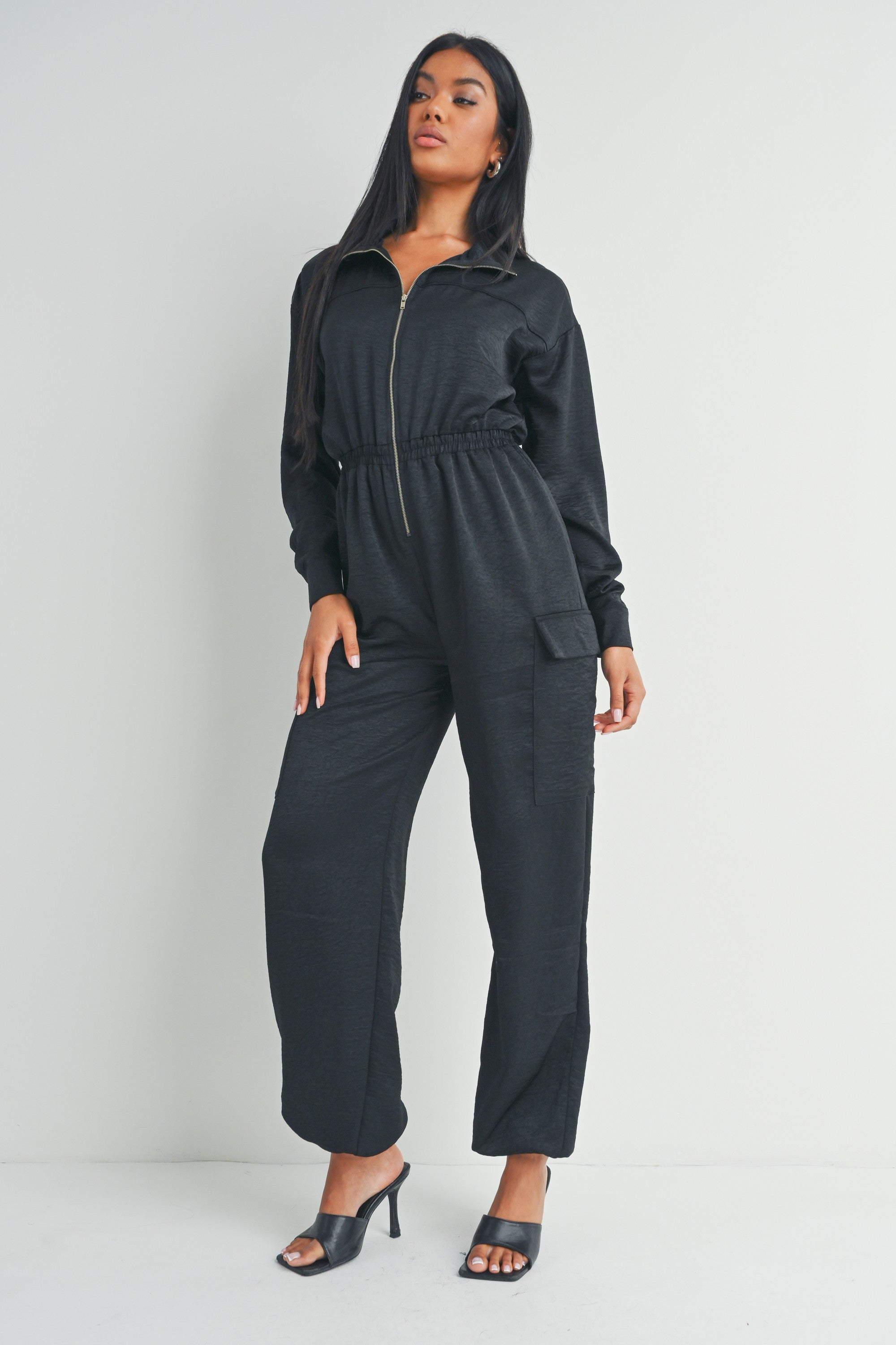 This black long-sleeved zip-up jumpsuit features a collared neckline, utility pockets, and a cinched waist for a flattering fit.