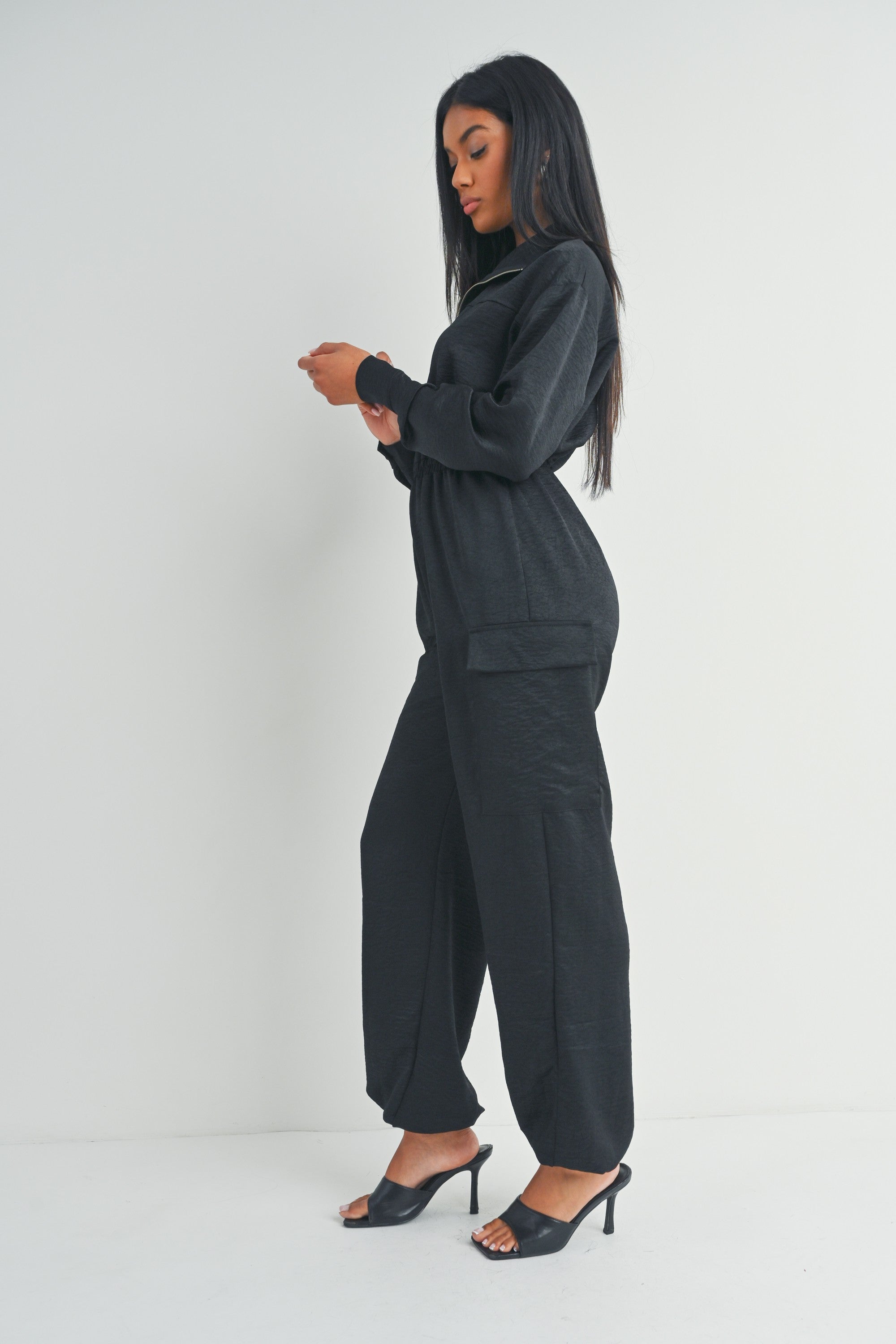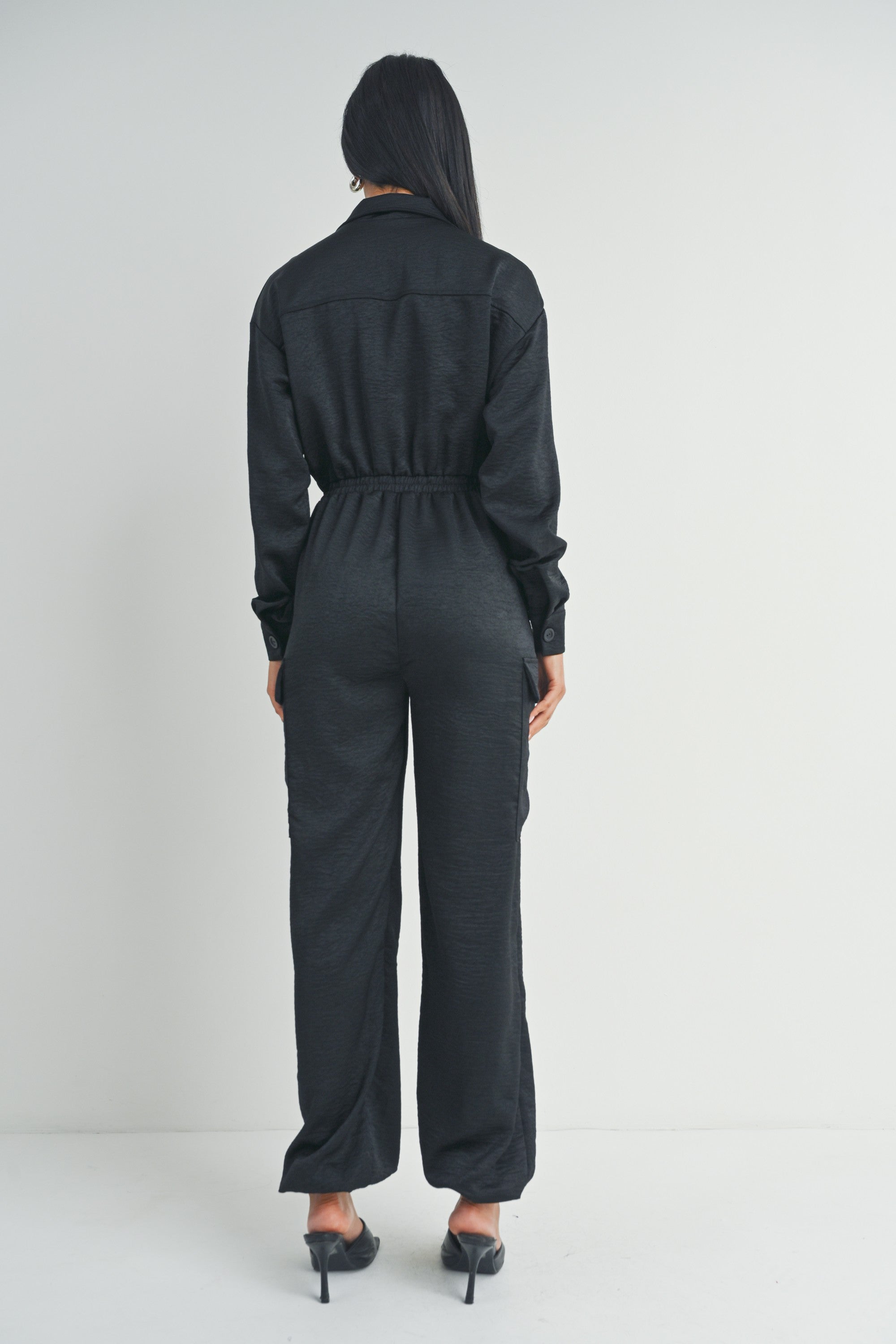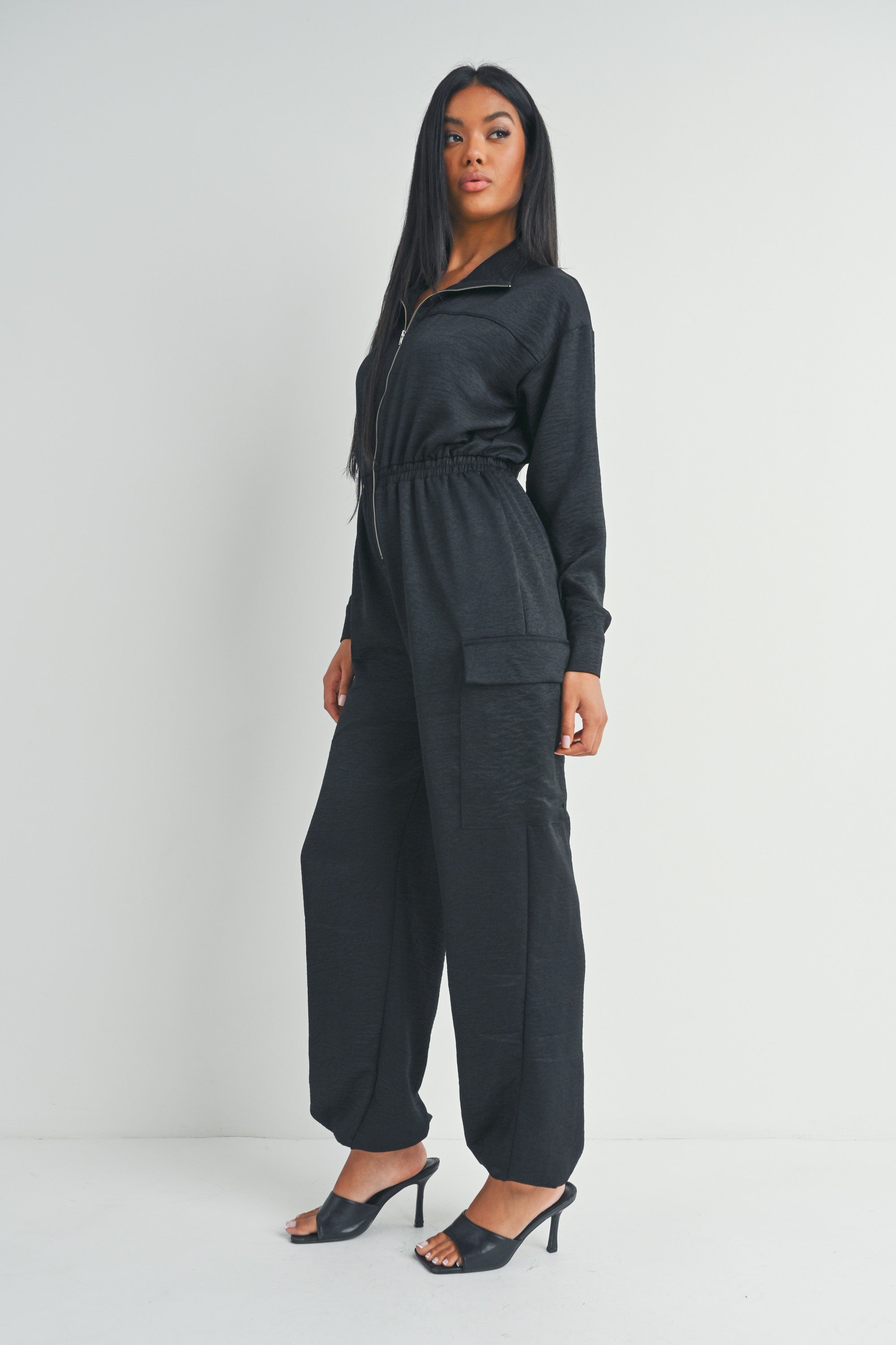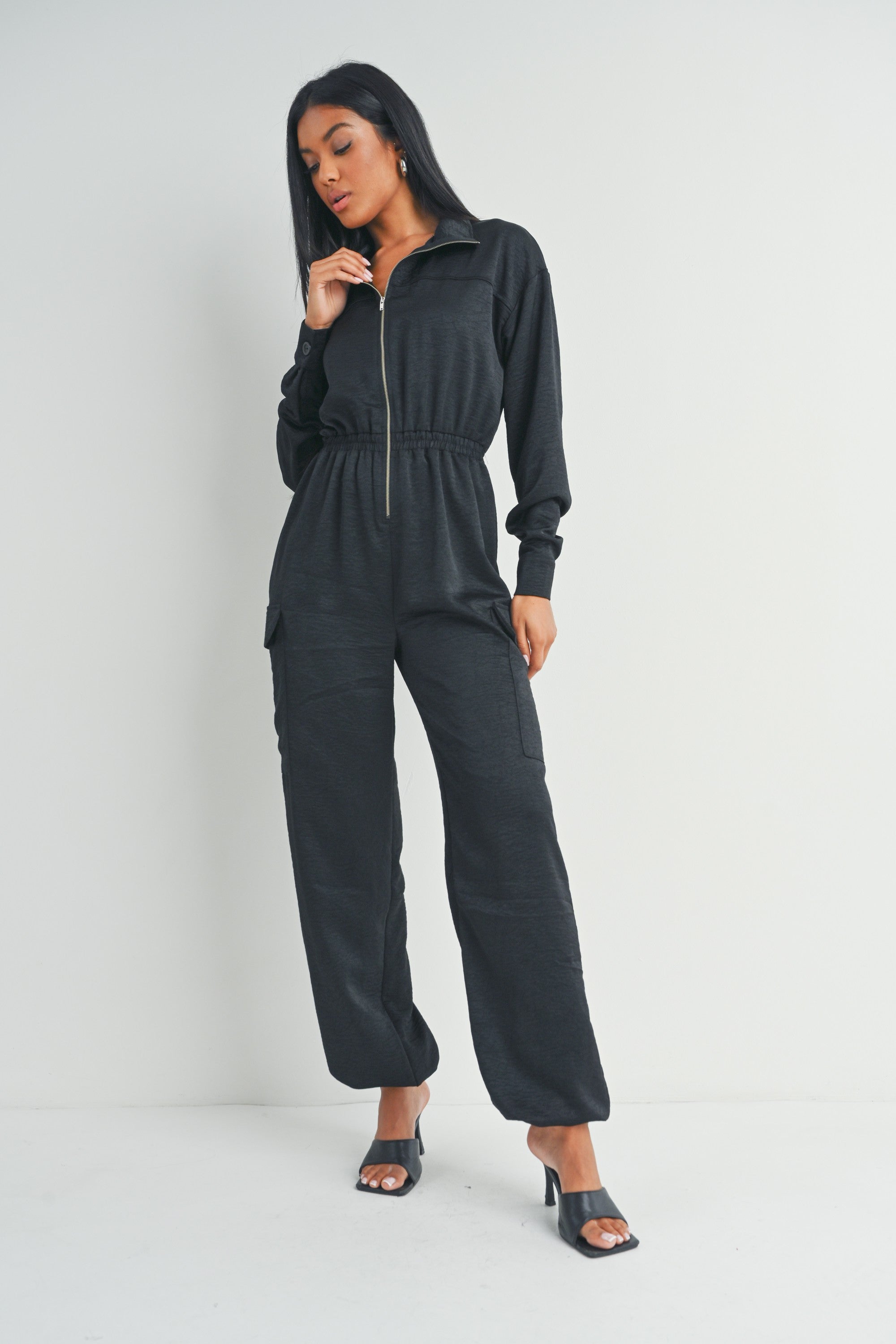 This black long-sleeved zip-up jumpsuit features a collared neckline, utility pockets, and a cinched waist for a flattering fit.